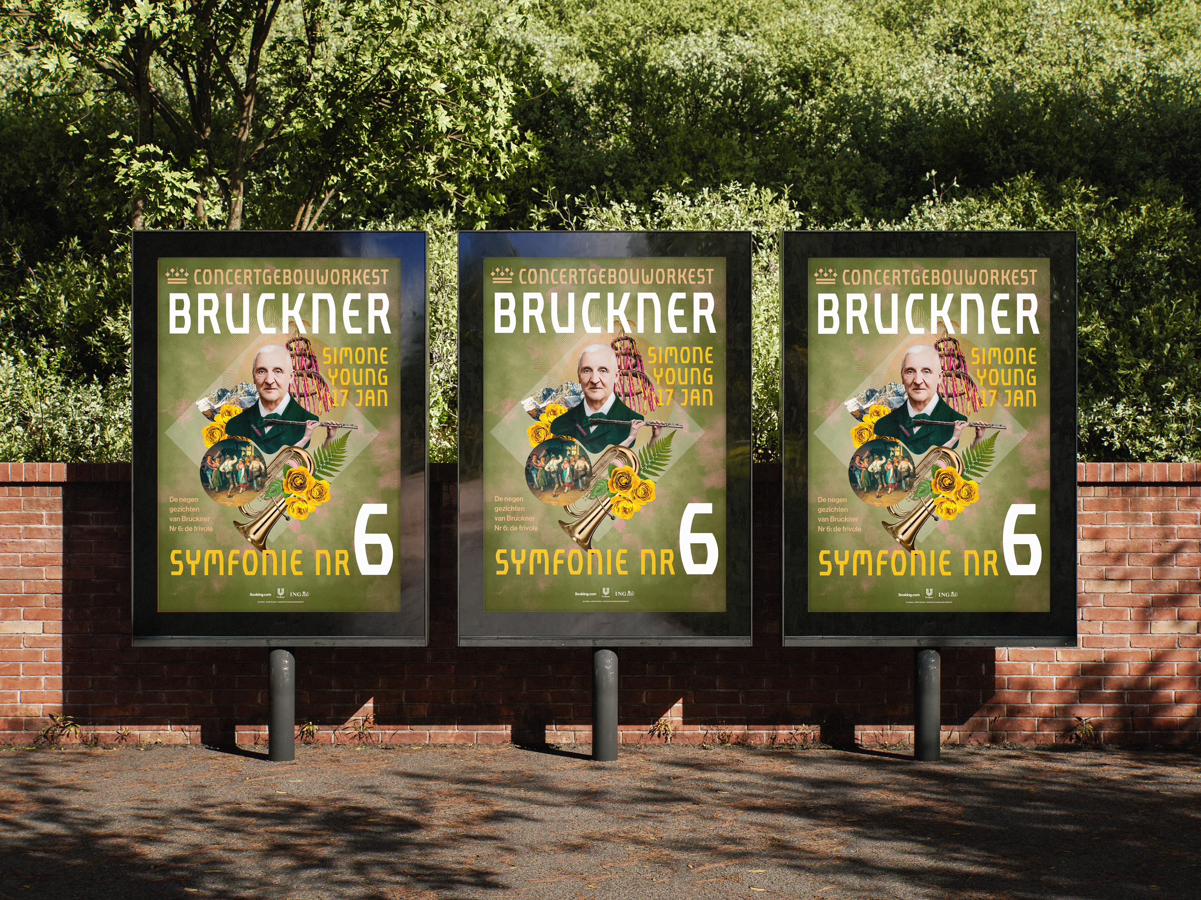 Bruckner was diep gelovig, obsessief, kwetsbaar én groots. Net als zijn symfonieën. Elke uitvoering kreeg een eigen uiting die een karaktertrek van Bruckner verbeeldt. Zo werd de campagne niet alleen een visuele vertaling van zijn muziek, maar ook een uitnodiging om de mens achter de componist te ontdekken. Een gelaagde identiteit, dat eenvoudig doorvertaalbaar was naar posters, programmaboekjes, online en podcast.